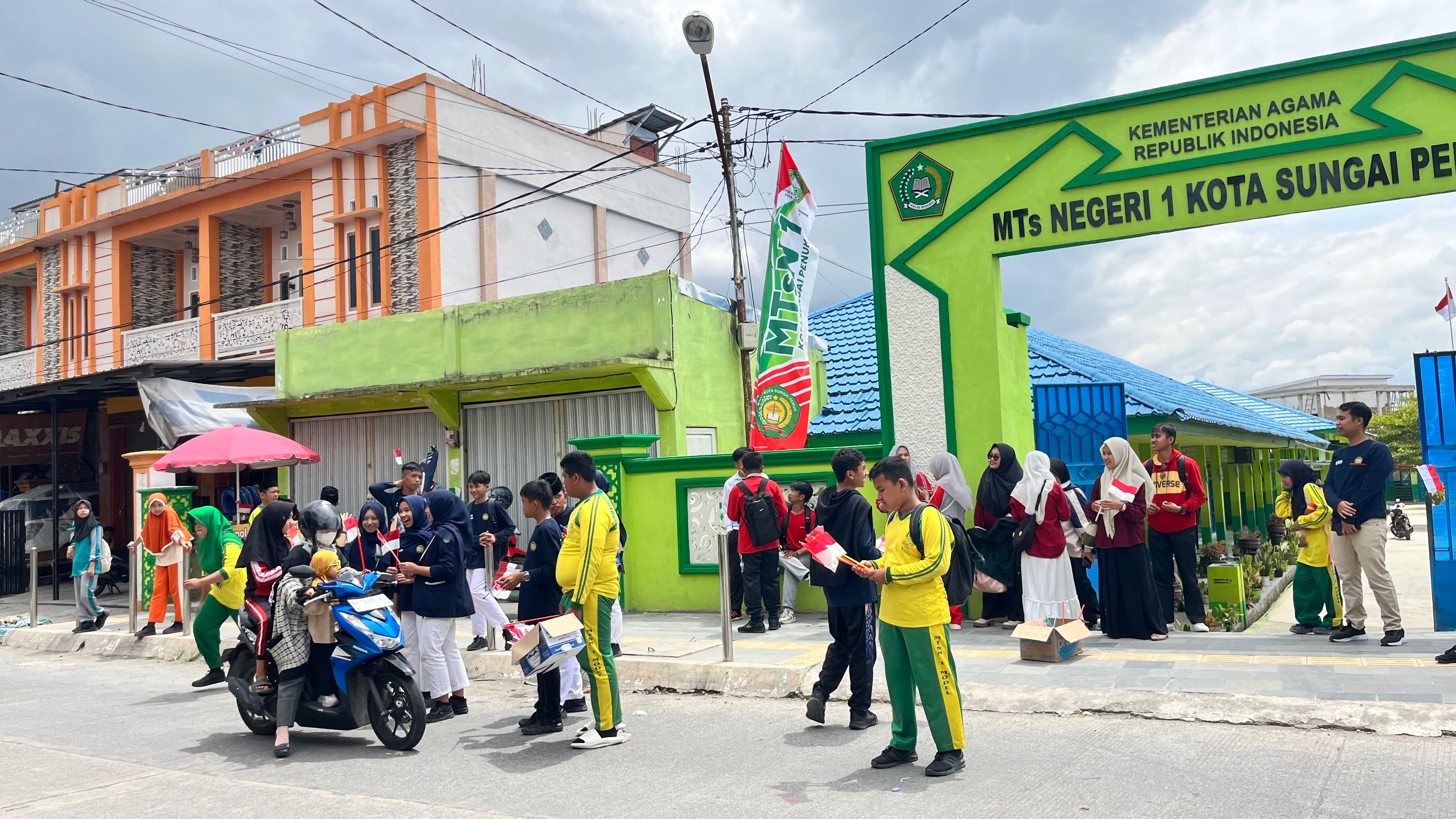 Ratusan bendera dibagikan langsung oleh para siswa MTsN 1 Kota Sungai Penuh kepada warga yang melintas di depan madrasah. Suasana penuh semangat dan kebersamaan tampak mewarnai kegiatan tersebut, yang juga menjadi ajang silaturahmi antara pihak madrasah dan masyarakat sekitar.