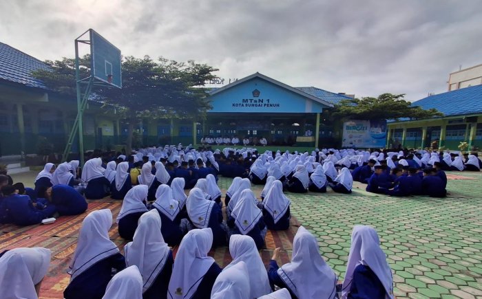 Seluruh siswa, tenaga pendidik, dan tenaga kependidikan MTsN 1 Kota Sungai Penuh tampak bersemangat dan penuh perhatian dalam mendengarkan ceramah yang disampaikan.