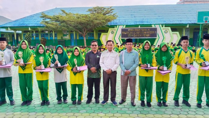 Sungai Penuh ( MTsN 1 Kota Sungai Penuh ) - Kepala MTsN 1 Kota Sungai Penuh, Bapak Soni Indra, S.PdI., M.Pd, didampingi oleh Wakil Kepala Madrasah Bidang Kurikulum, menyerahkan hadiah kepada para pemenang lomba dalam rangka Peringatan Isra' Mi'raj Nabi Muhammad SAW 1447 H. Kegiatan ini dilaksanakan di lapangan madrasah setelah pelaksanaan apel disiplin. Sabtu 24 Januari 2025